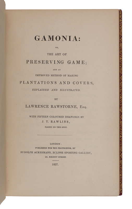RAWSTORNE, Lawrence (1774-1850). Gamonia: or, The Art of Preserving Game. London: Rudolph Ackermann, 1837.