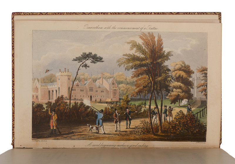 8vo (232 x 149mm). Half-title, errata slip. 15 hand-colored and finished aquatint plates by and after J. T. Rawlins. (Final text leaf heavily toned from morocco cover bound in.) Late 19th-century morocco gilt by Morrell for Scribners, with original morocco covers bound in at end (joints a little dried, slight wear to head of spine, upper hinge starting); morocco folding case.