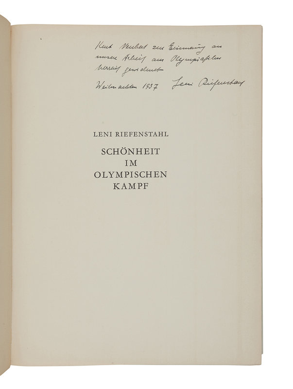 FIRST EDITION, PRESENTATION COPY INCSCRIBED BY RIEFENSTAHL in German: “Cordially dedicated to Kurt Neubert as a memento of our collaboration on the Olympia film. Leni Riefenstahl, Christmas 1937.” Riefenstahl and Neubert are pictured together on pg.259. Kurt Neubert was a cinematographer who worked with Riefenstahl on the 1938 films Olympia: Fest der Völker (part 1) and Olympia: Fest der Schönheit (part 2). They had previously worked together on Der Heilige Berg (1926), and Der Grosse Sprung (1927). 101 Books, pp.96-7; Auer 255; The Photobook, vol. I, p.151 (“A lavish photobook”). A FINE ASSOCIATION COPY.