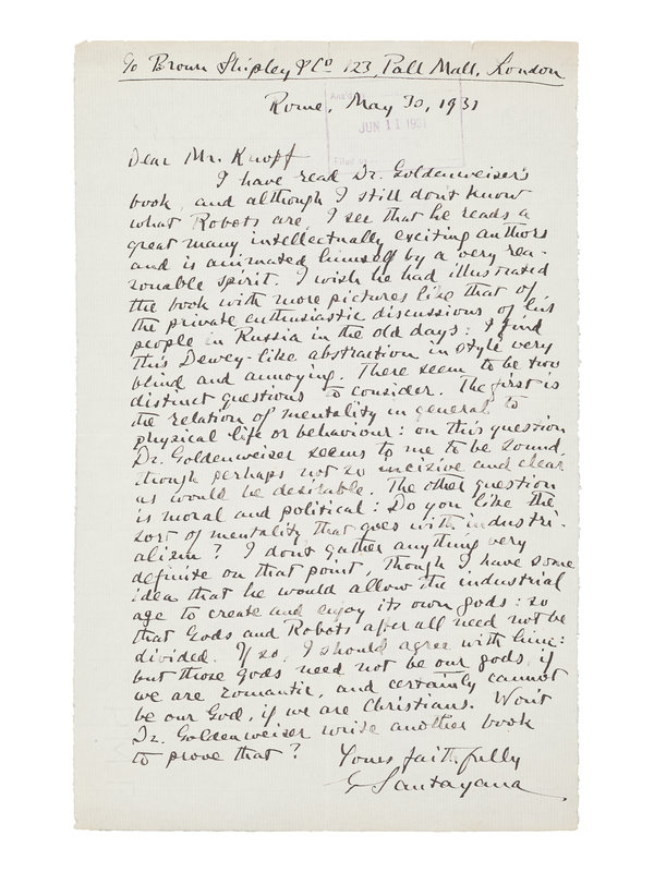 SANTAYANA, George (1863-1952). Autograph letter signed (“Santayana”), to [Alfred A.?] Knopf. Rome, 30 May 1931. 1 page, 8vo, with received stamp dated 11 June 1931, small tears along top edge.