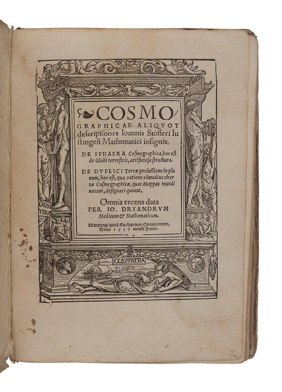 STOEFFLER, Johann (1452-1531). Cosmographicae aliquot descriptiones… De Sphaera Cosmographica, hoc est de Globi terrestris, artificiosa structura. De Duplici Terrae proiectione in planum…Edited by Johann Dryander (1500-1560). Marburg: Eucharius Cervicornus, 1537.