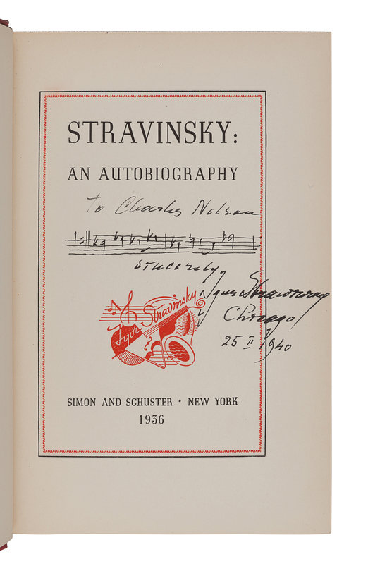 FIRST EDITION, PRESENTATION COPY INSCRIBED BY STRAVINSKY WITH AN AUTOGRAPH MUSICAL QUOTATION: “To Charles Nelson Sincerely Igor Stravinsky Chicago 25 II 1940.” The Chicago Symphony Orchestra gave the world premiere performances of Stravinsky’s Symphony in C on November 7, 8, and 12, 1940, with Stravinsky conducting.