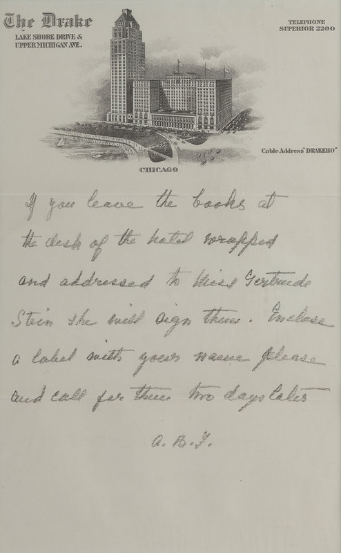 “If you leave the books at the desk of the hotel wrapped and addressed to Miss Gertrude Stein she will sign them. Enclose a label with your name please and call for them two days later.”