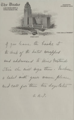 TOKLAS, Alice B. (1877-1967). Autograph note signed (“A.B.T.”). Chicago, n.d, late 1934-early 1935. 1 page, 8vo, visible area 230 x 144 mm, on Drake Hotel stationary, light creasing, matted and framed with a photographic portrait of Alice B. Toklas and Gertrude Stein after an image by Carl Van Vechten, unexamined out of frame.