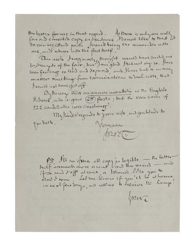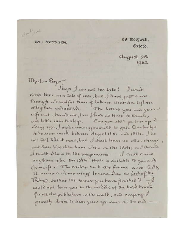 TOLKIEN, John Ronald Reuel (1892-1973). Autograph letter signed (“JRRT”). To George Sayer, Oxford, 7 August 1952. 2 pages, 8vo, on 99 Holywell, Oxford stationery, creased; morocco folding case.