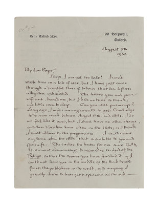 George Sayer received a copy of Tolkien’s manuscript from their mutual friend, C. S. Lewis. Sayer and his wife became enthusiastic fans of the work, and invited Tolkien to stay with them at Malvern in August when he was on break. Having heard that publisher George Allen & Unwin had an interest in publishing the work, Tolkien writes George Sayer to request the return of the manuscript and to coordinate a visit: “Can you still put me up?...I could come any time after the 18th that is suitable to you and your wife. The earlier the better for me since G. A. & U. are now clamouring to reconsider the Lord of the Rings, so that the sooner you have finished it – I could not leave you in the middle of the third book for all the publishers in the world, and anyway I greatly desire to hear your opinions at the end – the better for me in that regard.”