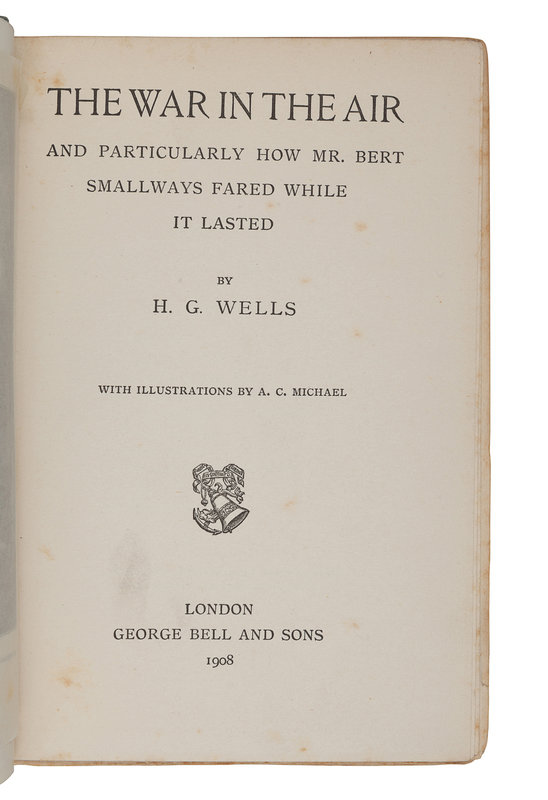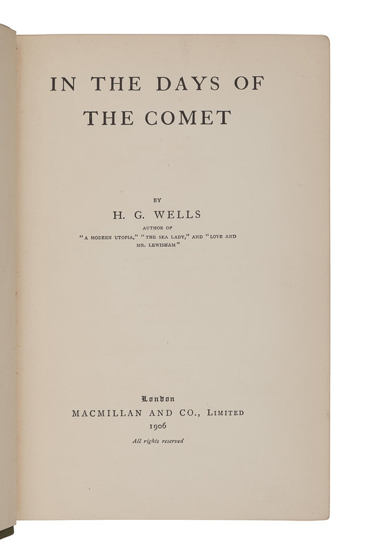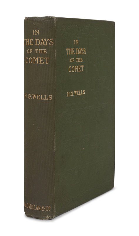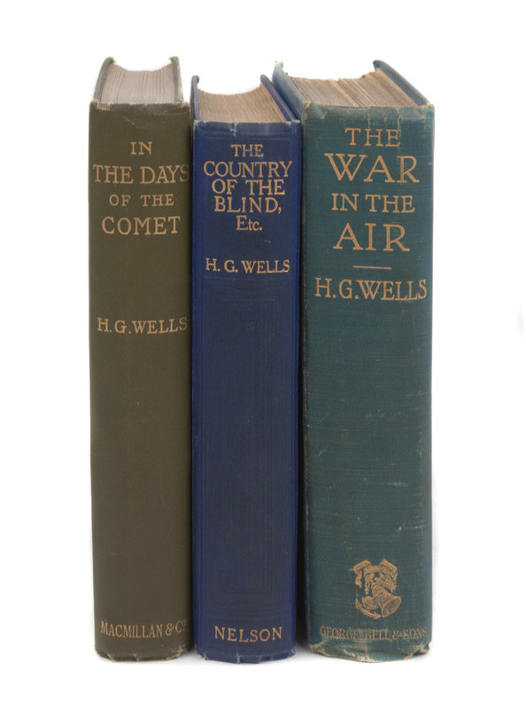 In the Days of the Comet. London: Macmillan and Co., Limited, 1906. Provenance: Gift inscription, 11 September 1906. Currey, 519-520. -- The War in the Air. And Particularly How Mr. Bert Smallways Fared While it Lasted. London: George Bell and Sons, 1908. Currey, 526. – The Country of the Blind and Other Stories. London, Edinburgh, Dublin, Leeds, and New York: Thomas Nelson and Sons, [1911]. Currey, 517. -- Together, 3 works in 3 volumes, 8vo, ALL FIRST EDITIONS, all in original publisher’s cloth, condition generally good to fine.