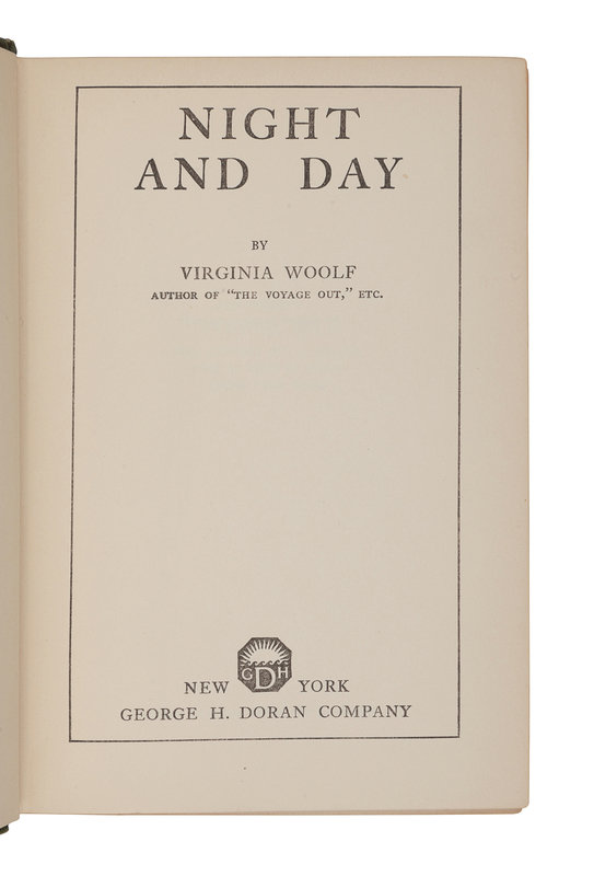 FIRST AMERICAN EDITION of Woolf’s second novel. Set in Edwardian London, Night and Day contrasts the daily lives of Katharine Hilbery and Mary Datchet, which she considered to be her “traditional” novel written in the style of the 19th-century novelists she admired. Doran likely only printed one impression; by 1929, only 1,326 copies had been sold. Kirkpatrick A4b.