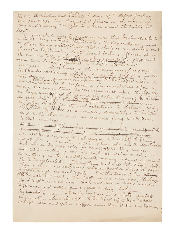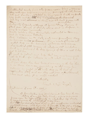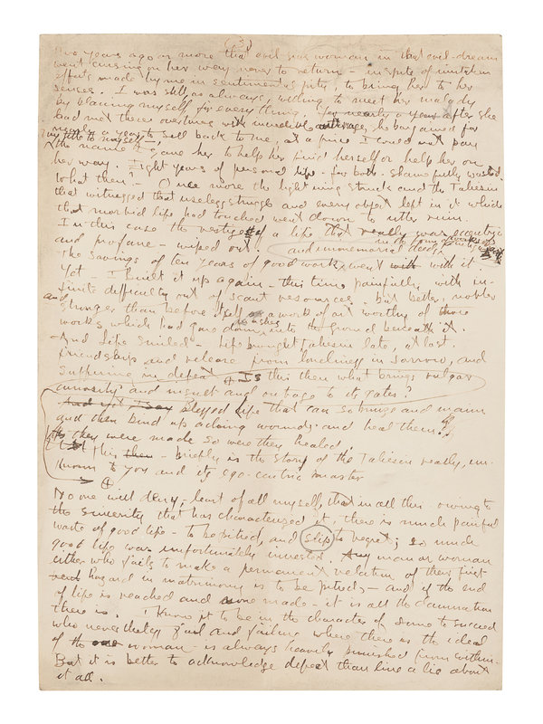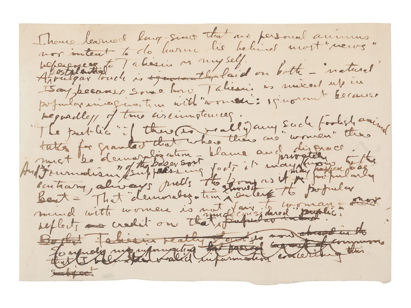 Writing shortly after scandal with Miriam Noel (see previous lot), Wright carefully considers the past and the future of Taliesin. After the devastating fire and tragedy that took the life of his partner Mamah Cheney in 1914, Wright rebuilt Taliesin II, where he lived with his second wife, Miriam Noel Wright. On 20 April 1925, Taliesin was yet again destroyed by fire.