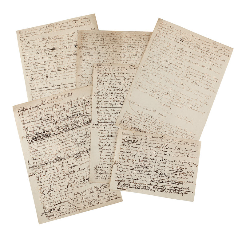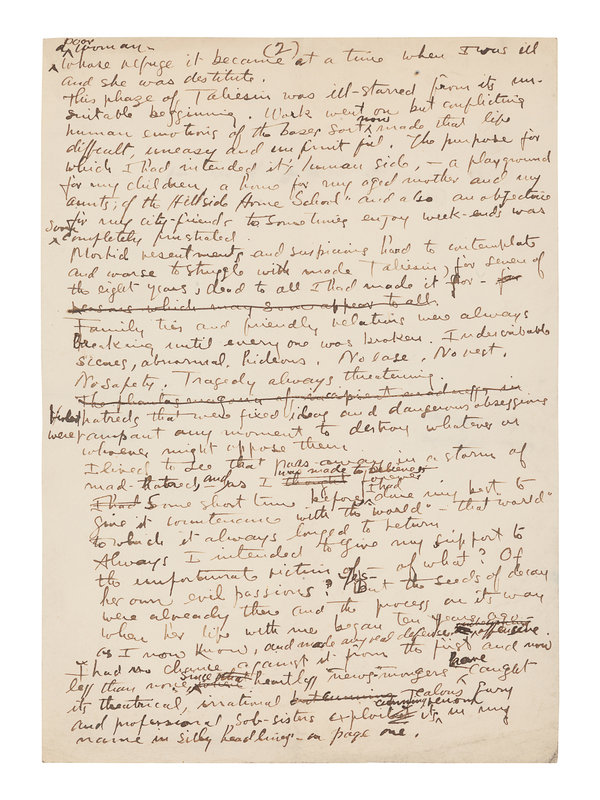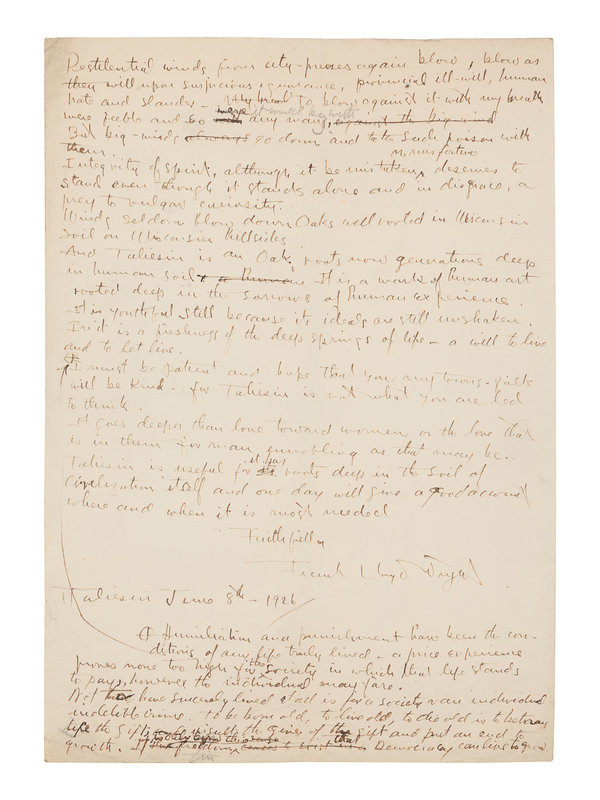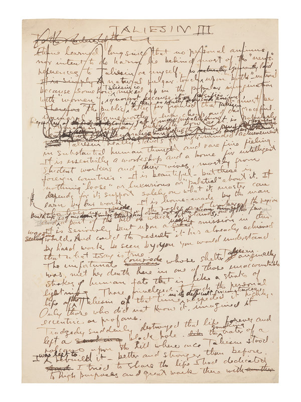 WRIGHT, Frank Lloyd (1867-1959). Autograph manuscript signed ("Frank Lloyd Wright"), entitled "Taliesin III," numerous holograph emendations and corrections in ink, a few in pencil N.p. Taliesin, 8 June 1926. 5 1/2 pages, 4to, creased.