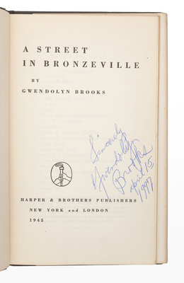 FIRST EDITION, PRESENTATION COPY INSCRIBED BY BROOKS: "Sincerely, Gwendolyn Brooks, April 15, 1997." Brooks published her first poem when she was 13 and her compositions were regularly printed in newspapers, especially The Chicago Defender, throughout her adolescence and early adulthood. A Street in Bronzeville, her first book of poetry, was recommended by Richard Wright to Harper & Brothers. Wright wrote that Brooks's poems "are hard and real, right out of the central core of Black Belt Negro life in urban areas...She easily catches the pathos of petty destinies; the whimper of the wounded; the tiny accidents that plague the lives of the desperately poor, and the problems of color prejudice among Negroes." (Kent, A Life..., p.62).