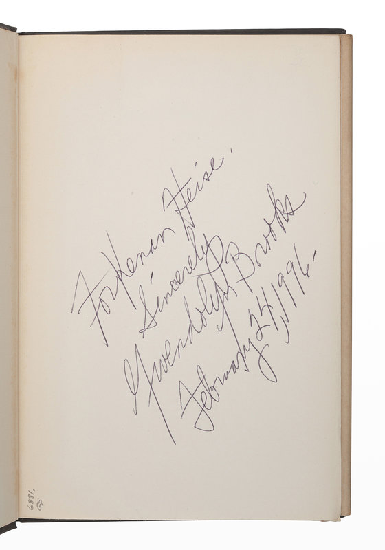 FIRST EDITION, PRESENTATION COPY INSCRIBED BY BROOKS: "For Kenan Heise. Sincerely, Gwendolyn Brooks, February 24, 1996." Brooks was awarded the Pulitzer Prize in 1950 for this collection of poetry, the first African American recipient of the award.