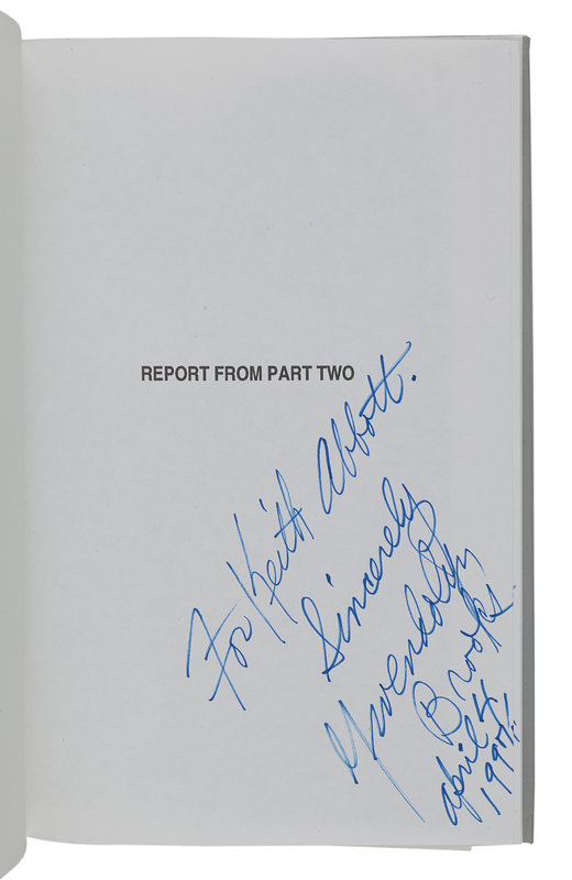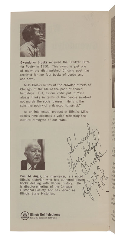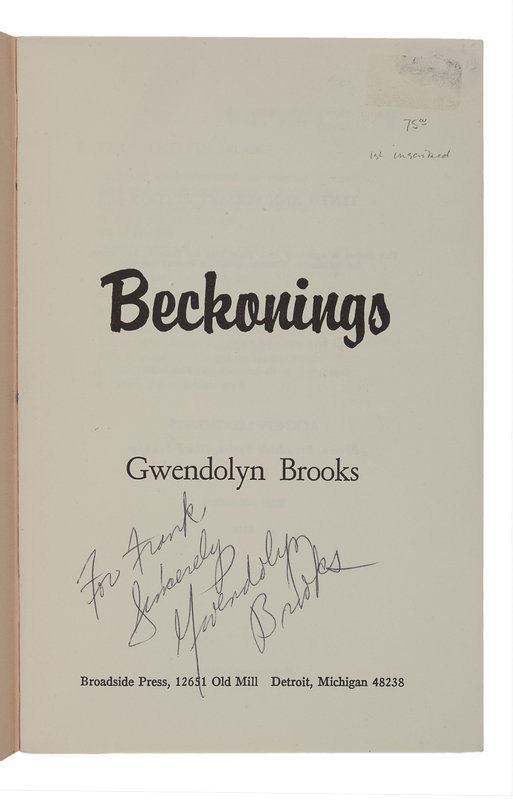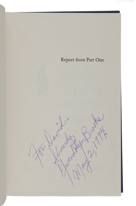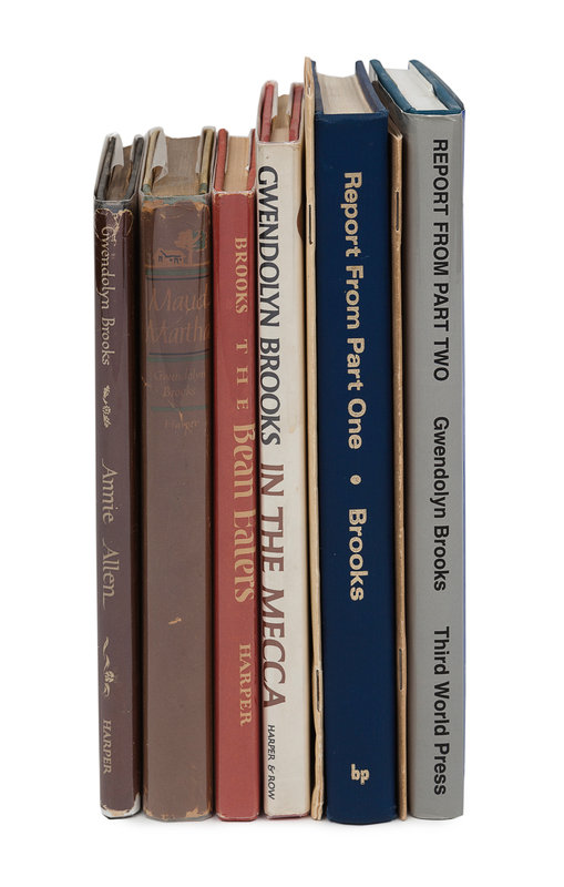 Maud Martha: New York: Harper & Brothers, 1953. -- We Asked Gwendolyn Brooks About the Creative Environment in Chicago. Chicago: Illinois Bell Telephone, [1967]. INSCRIBED. -- Beckonings. Detroit: Broadside Press, 1975. INSCRIBED. -- Report from Part One. Detroit: Broadside Press, 1972. INSCRIBED. -- Report from Part Two. Chicago: Third World Press, 1996. INSCRIBED. -- And 3 others. Together, 8 works in 8 volumes, 8vo, all FIRST EDITIONS, condition generally fine.