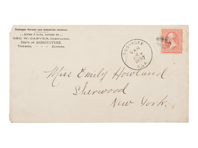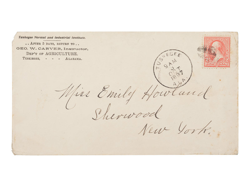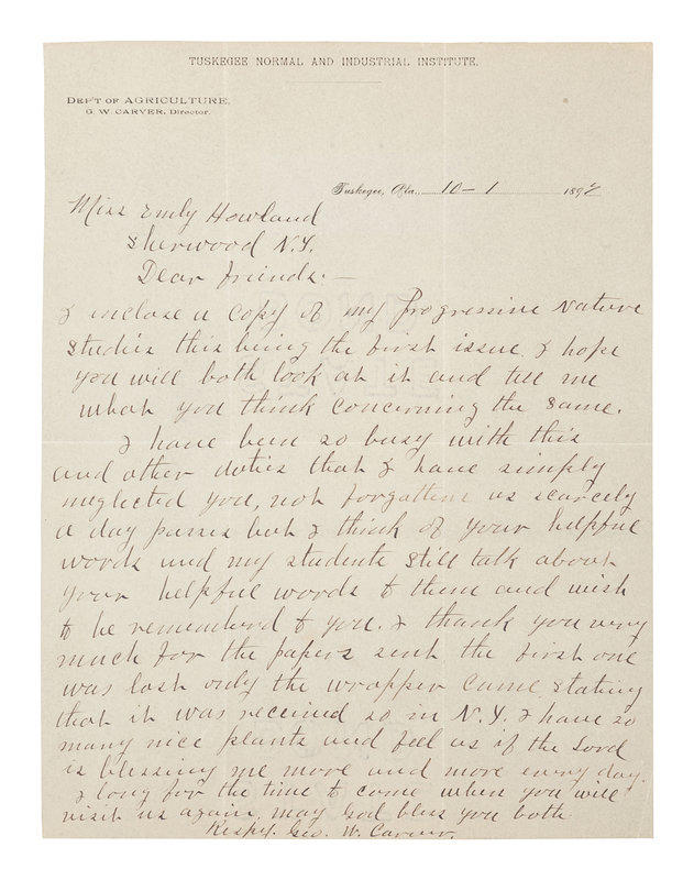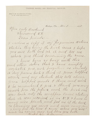 CARVER, George Washington (1860s-1943). Autograph letter signed (“Geo. W. Carver”), as Director of the Department of Agriculture at Tuskegee Institute, to Emily Howland. Tuskegee, AL, 1 October 1897. 1 page, 8vo, on Tuskegee Normal and Industrial Institute Department of Agriculture letterhead, with envelope, light creasing.