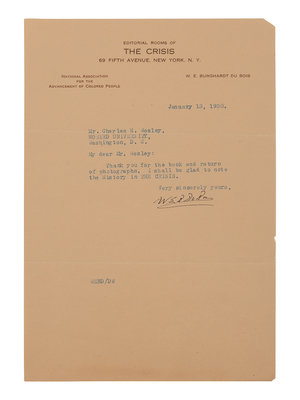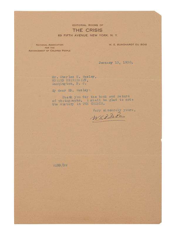 DU BOIS, William Edward Burghardt (1868-1963). Typed letter signed (“W. E. B. Du Bois”), as editor of The Crisis, to Charles H. Wesley. New York, 13 January 1930. 1 page, 8vo, on Editorial Rooms of The Crisis, National Association for the Advancement of Colored People letterhead, evenly toned, light creasing.