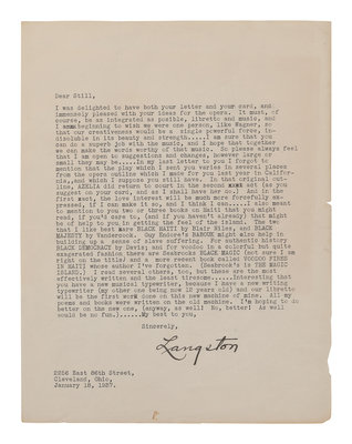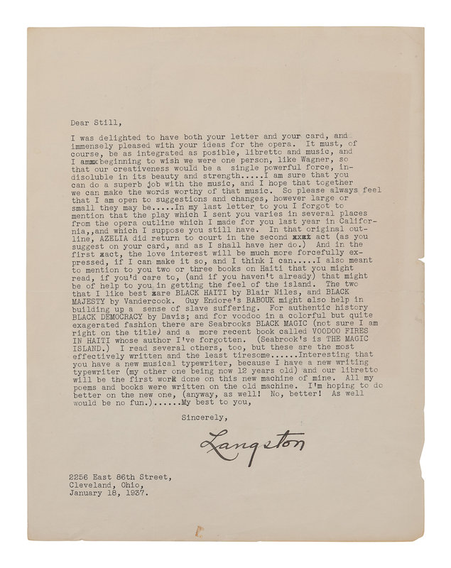 HUGHES, Langston (1901-1967). Typed letter signed (“Langston”), to William Grant Still. Cleveland, OH, 18 January 1937. 1 page, 8vo, small chips to left edge.