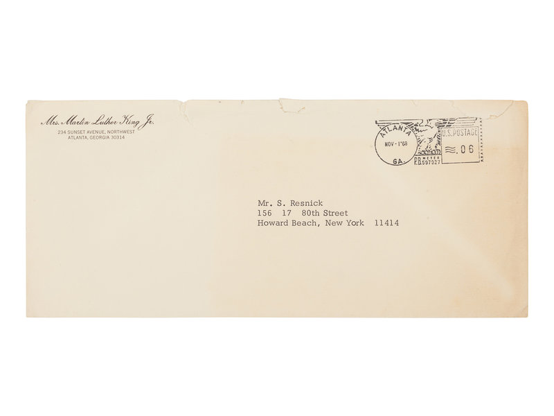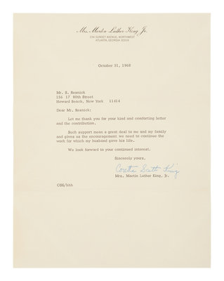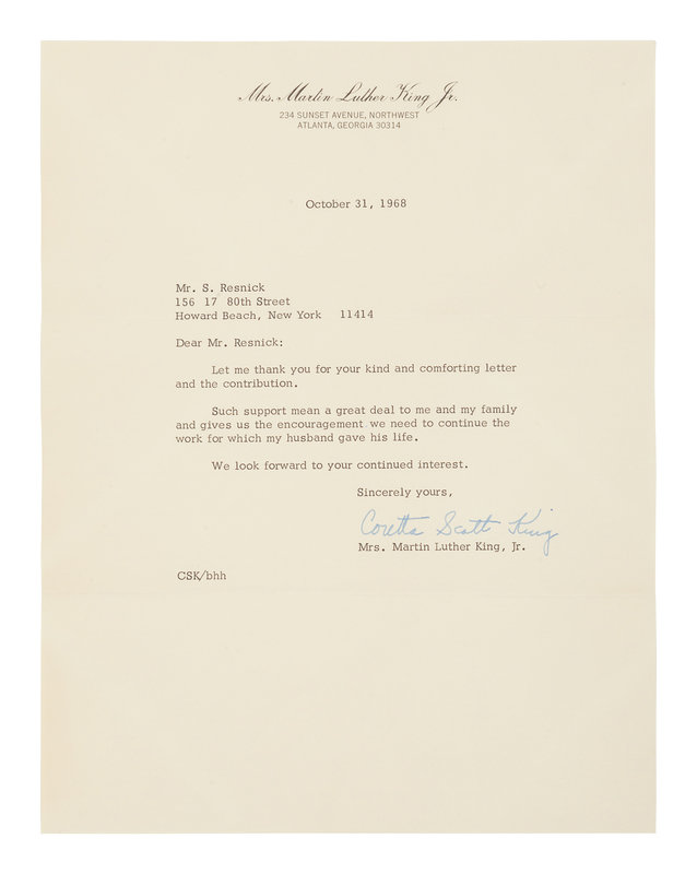 KING, Coretta Scott (1927-2006). Typed letter signed (“Coretta Scott King”) to Mr. S. Resnick. Atlanta, 31 October 1968. 1 page, 8vo, on Mrs. Martin Luther King Jr. letterhead.