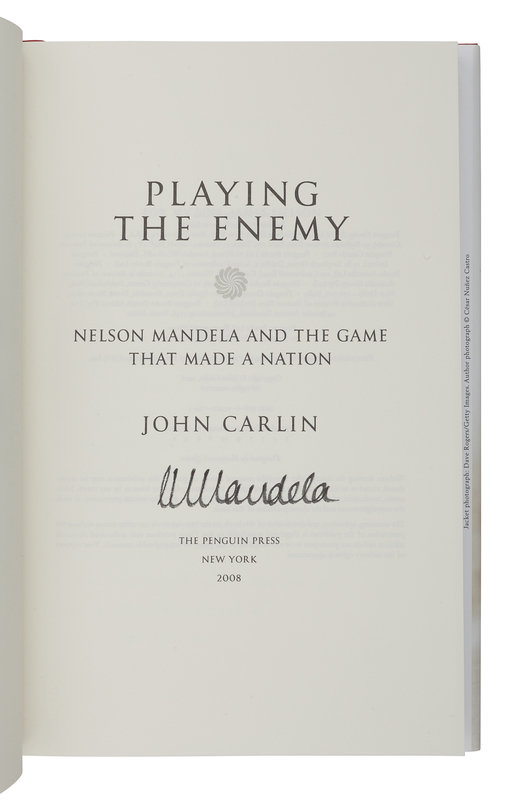 FIRST EDITION, SIGNED BY NELSON MANDELA, of Carlin's history of the 1995 Rugby World Cup held in South Africa. Nelson Mandela's integral role in reshaping and racially integrating the South African National Team, the Springboks, to serve as a unifying force in post-Apartheid South Africa, was adapted into the 2009 film Invictus.