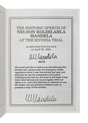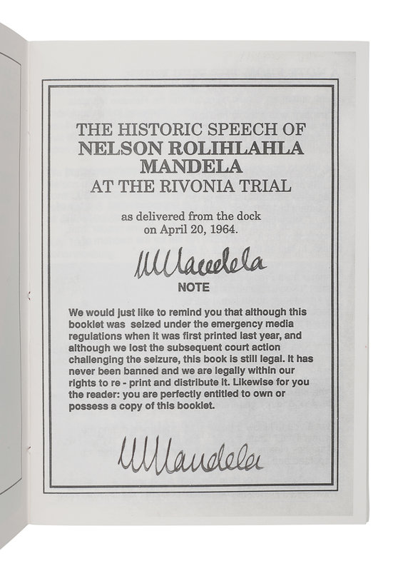 Second edition, TWICE SIGNED BY MANDELA on title-page: once in his hand, and with one autopen signature. Originally printed in 1987 but "was seized under the emergency media regulations" and no copies are known to still exist. This reprint was published to mark Mandela's 70th birthday, which he celebrated while still imprisoned. Despite the title page disclaimer, the publication was likely suppressed quickly leading to its scarcity. RARE: According to online records, no copies have ever sold at auction and OCLC locates only 12 copies.