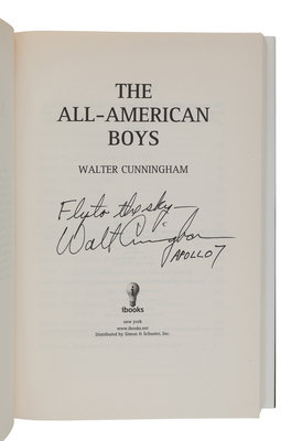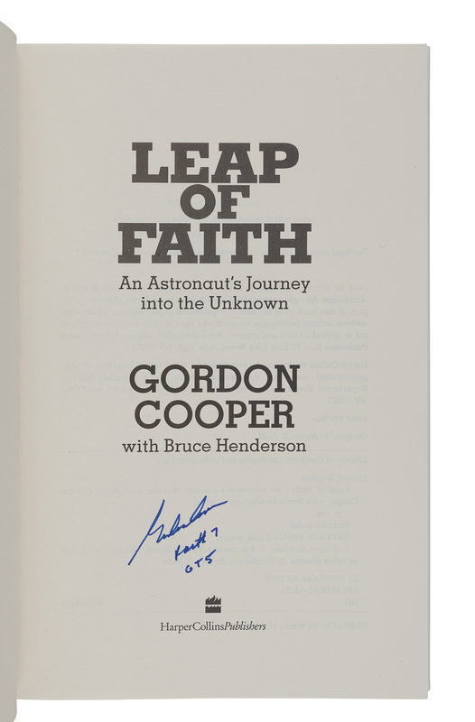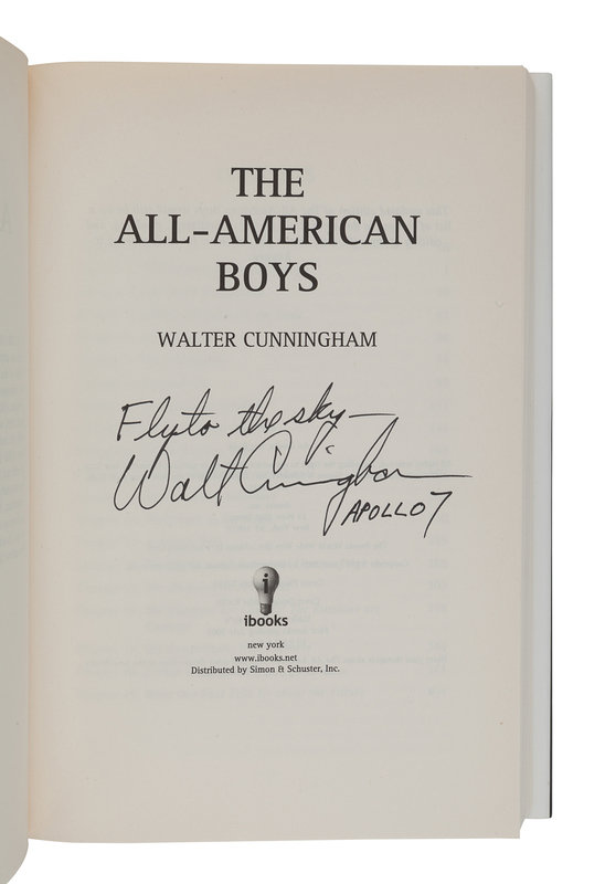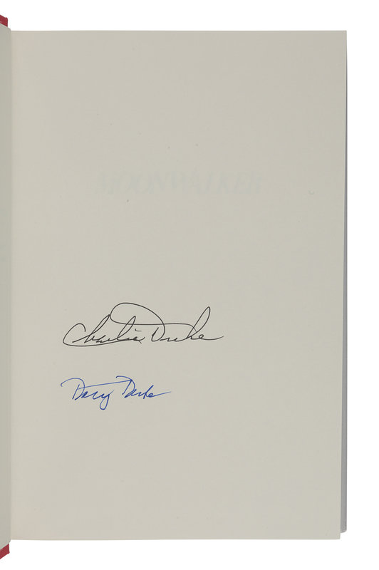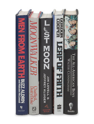 ALDRIN, Buzz. Men from Earth. New York: Bantam Books, 1989. SIGNED BY ALDRIN. -- DUKE, Charlie and Dotty. Moonwalker. Nashville: Oliver Nelson, 1990. SIGNED BY CHARLIE AND DOTTY DUKE. -- LOVELL, Jim. Lost Moon. The Perilous Voyage of Apollo 13. Boston and New York: Houghton Mifflin Company, 1994. SIGNED BY LOVELL. -- COOPER, Gordon. Leap of Faith. An Astronaut’s Journey into the Unknown. New York: Harper Collins, 2000. SIGNED BY COOPER. -- CUNNINGHAM, Walter. The All-American Boys. New York: ibooks, 2003. Later edition, SIGNED BY CUNNINGHAM. -- Together, 5 works in 5 volumes, 8vo. FIRST EDITIONS (except where indicated) ALL SIGNED, original publisher’s bindings and dust jackets. Condition generally fine.