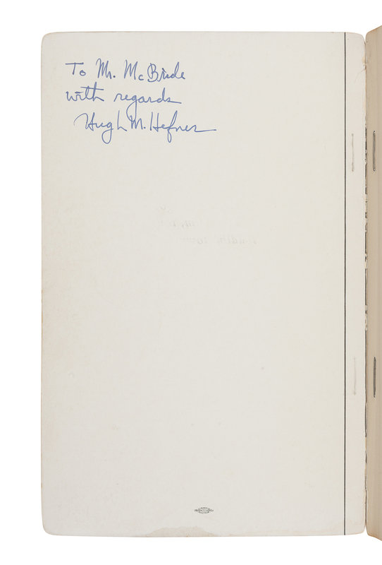 FIRST EDITION, FIRST ISSUE, PRESENTATION COPY INSCRIBED BY HEFNER: “To Mr. McBride with regards Hugh M. Hefner.” “Of this book, and of the countless hours spent in its creation Mr. Hefner says: (Nasty four letter word deleted by publisher)” (blurb rear cover).