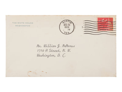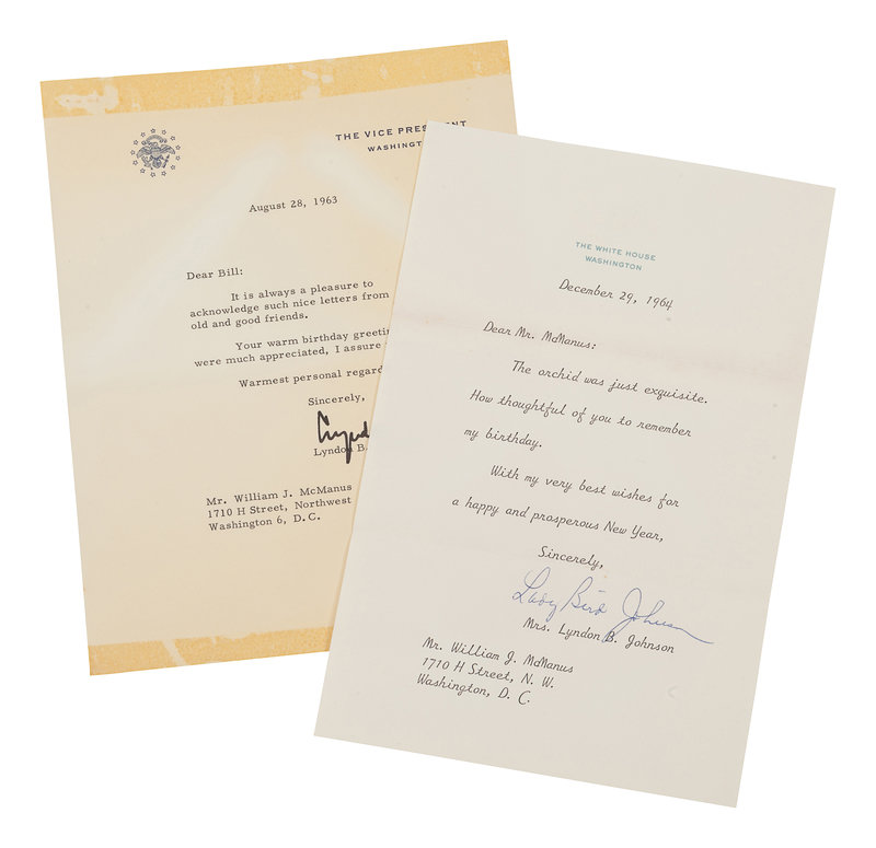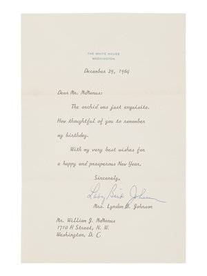 JOHNSON, Claudia “Lady Bird” (1912-2007). Typed letter signed (“Lady Bird Johnson”), as First Lady, to William J. McManus. Washington D. C., 29 December 1964. 1 page, 8vo, on White House letterhead, with envelope, minor toning at creases. A note of gratitude: “The orchid was just exquisite. How thoughtful of you to remember my birthday.”