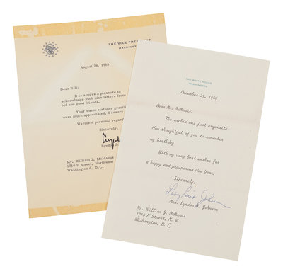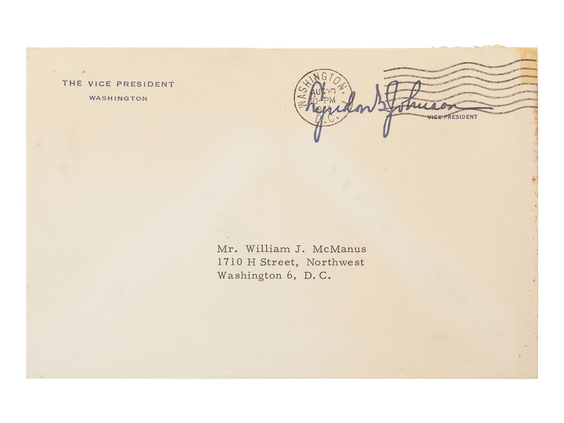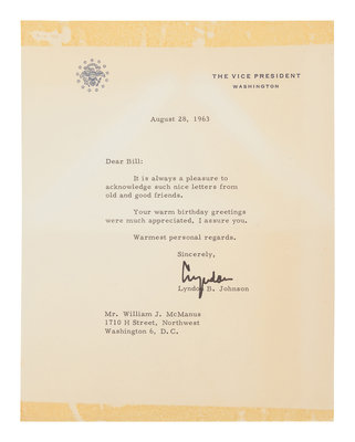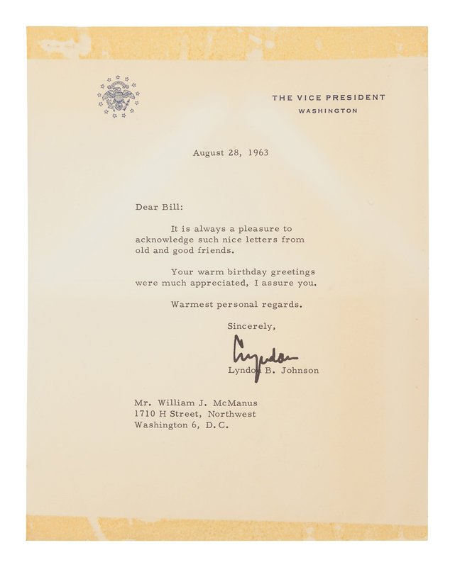 JOHNSON, Lyndon B. (1908-1973). Typed letter signed (“Lyndon”), as Vice President, to William J. McManus. Washington D.C., 28 April 1963. 1 page, 8vo, on Vice President stationary, with envelope, toning, adhesive residue to upper and lower margins.