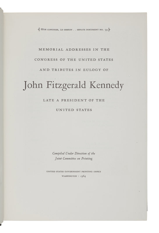 [KENNEDY, John Fitzgerald]. Memorial Addresses in the Congress of the United State and Tribute in Eulogy of John Fitzgerald Kennedy Late a President of the United States. Washington, D. C.: United States Government Printing Office, 1964.