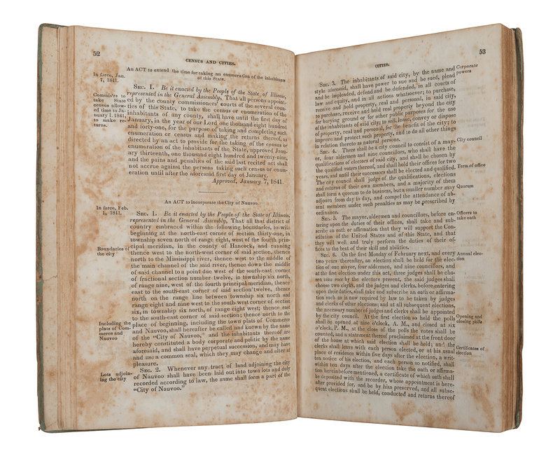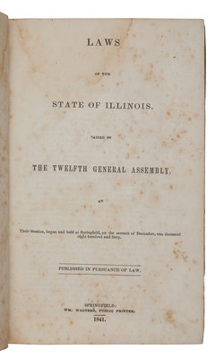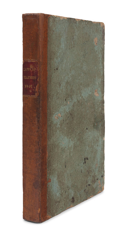 FIRST EDITION. During the 1840-1841 session of the Illinois General Assembly, laws were passed incorporating Nauvoo as a city (pp.52-57), incorporating the Nauvoo House Association (pp.131-132), incorporating the Nauvoo Agricultural and Manufacturing Association (pp.139-145), and appointing a Notary Public to Nauvoo (p.190).