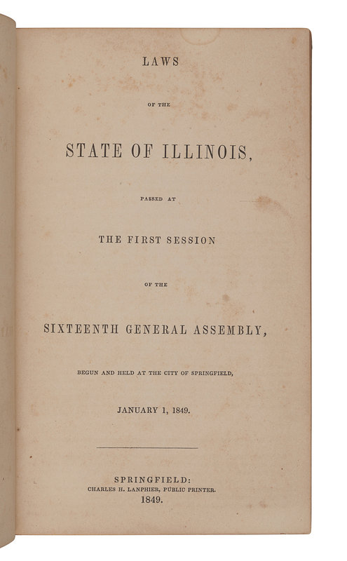 [MORMONISM]. Laws of the State of Illinois, Passed by the First Session of the Sixteenth General Assembly, begun and held at the City of Springfield, January 1, 1849. Springfield: Charles H. Lanphier, 1849.
