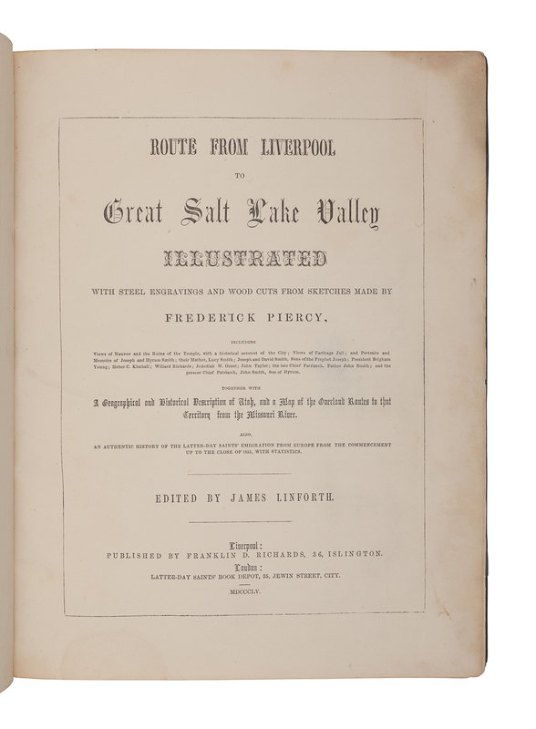[MORMONISM]. LINFORTH, James (1827-1899), editor. -- PIERCY, Frederick H. (1830-1891), illustrator. Route from Liverpool to Great Salt Lake Valley... Together With a Geographical and Historical Description of Utah, and a Map of the Overland Routes to that Territory, from Missouri River. Liverpool: Franklin D. Richards; London: Latter-Day Saints' Book Depot, 1855.