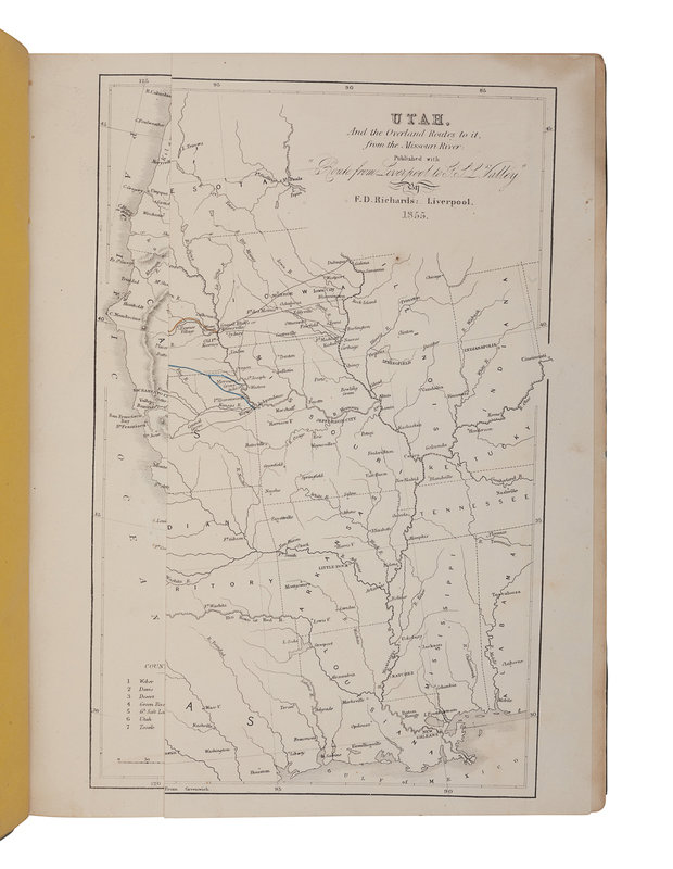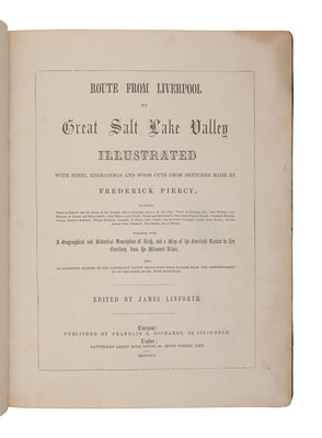 He wrote a detailed narrative of his travels, which he gave to James Linforth to edit on his return to England in early 1854. Linforth was an assistant editor of the Millennial Star (see lots 311 and 315), and he added extensive footnotes to Piercy’s narrative, including a comprehensive summary of the LDS emigration up to 1855. The book was originally published in 15 monthly parts beginning in July 1854. Flake 46; Graff 2501; Howes L-359; Sabin 4; Wagner-Camp 259.