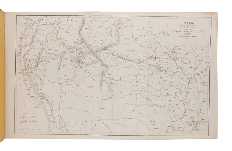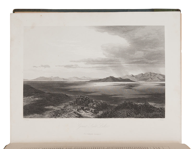 4to (309 x 238 mm). Folding frontispiece map "Utah and the Overland Routes to it, from the Missouri River," with the Utah border and routes hand colored in outline, 30 steel engraved plates, and woodcuts in text after Frederick H. Piercy. (Pale dampstain to lower margin, some browning or soiling.) Contemporary green half calf gilt (some minor rubbing or wear, library card pocket glued to front pastedown); cloth folding case.