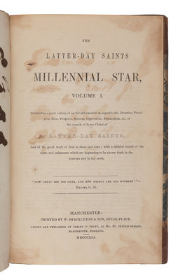 FIRST EDITION, THE FIRST MORMON PERIODICAL OUTSIDE OF THE UNTED STATES, edited by Parley Pratt in its first year of publication, and continually published until 1970. "It is difficult to overestimate the value of the Millennial Star…Its pages contain a continuous record of the progress of the Church in every corner of the globe, in some instances the only such record" (Crawley). Parley Pratt was eventually replaced as editor, and was later succeeded by his brother, Orson Pratt, who served as editor from 15 August 1848 through 15 December 1850.