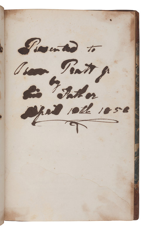 ORSON PRATT’S COPY, PRESENTED TO HIS SON ORSON PRATT JR.: “Presented to Orson Pratt Jr. by his Father, April 10th 1856.” Orson Pratt was ordained as a member of the original Quorum of the Twelve Apostles, called in 1835 under the direction of Joseph Smith. After Joseph Smith’s death, Pratt supported Brigham Young, and was part of the first party to arrive in Salt Lake Valley in 1847. He was called to return to Europe as a mission administrator between 1848 and 1851, during which time he served as the editor of the Millennial Star. His son, Orson Pratt, Jr., was the first born of his 45 children. He did not follow in the footsteps of his father into the hierarchy of Mormon leadership, and publicly renounced his faith in 1864. Crawley 71; Flake 4779. A SIGNIFICANT ASSOCIATION COPY.