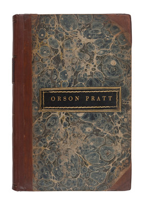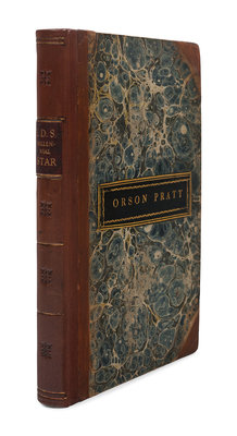 Numbers 1-12 in one volume, 8vo (208 x 131 mm). General title, preface and index bound at front. (Inscription heavily bled with offsetting and inkburn, some browning or spotting.) Contemporary half calf, marbled boards, black morocco lettering-piece gilt on upper cover (rebacked, corners restored). Provenance: Orson Pratt (1811-1881), Mormon theologian, original member of the Quorum of the Twelve Apostles of the Church of Jesus Christ of Latter-day Saints (gilt-lettered label on front cover); Orson Pratt Jr. (b.1837), (presentation inscription, see below).