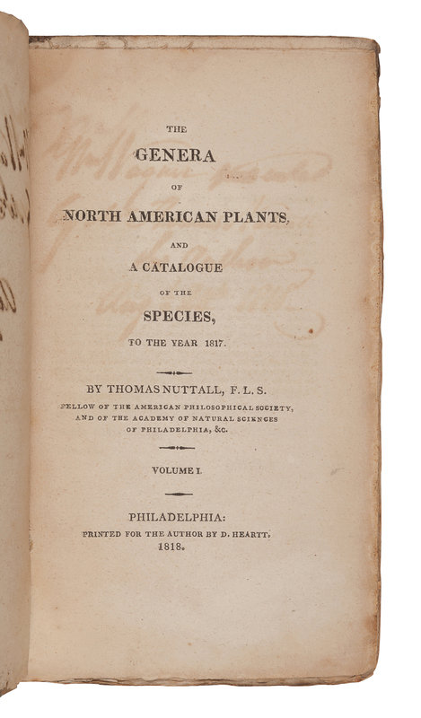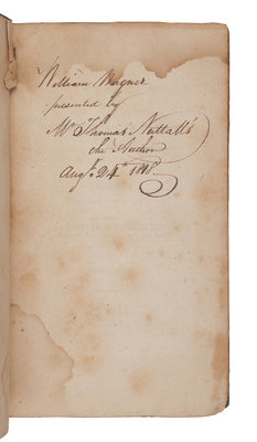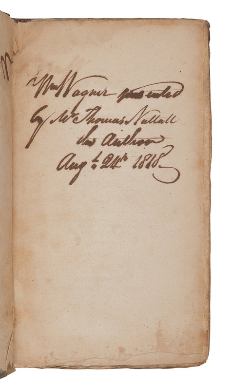 FIRST EDITION, PRESENTATION COPY, INSCRIBED BY NUTTALL: “Wm. Wagner presented by Mr. Thomas Nuttall the Author Aug. 24th 1818.” Thomas Nuttall and William Wagner were both early members of the Academy of Natural Sciences of Philadelphia, which was established in 1818. Other notable 19th-century members included Thomas Jefferson, Richard Owen, Georges Cuvier, Alexander von Humboldt, and John James Audubon. Wagner founded the Wagner Free Institute of Science in Philadelphia to provide free lectures and demonstrations for the public, which also housed a fine scientific library. Pritzel 6772; Sabin 56347. A FINE ASSOCIATION COPY.