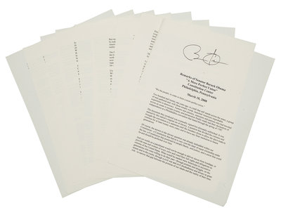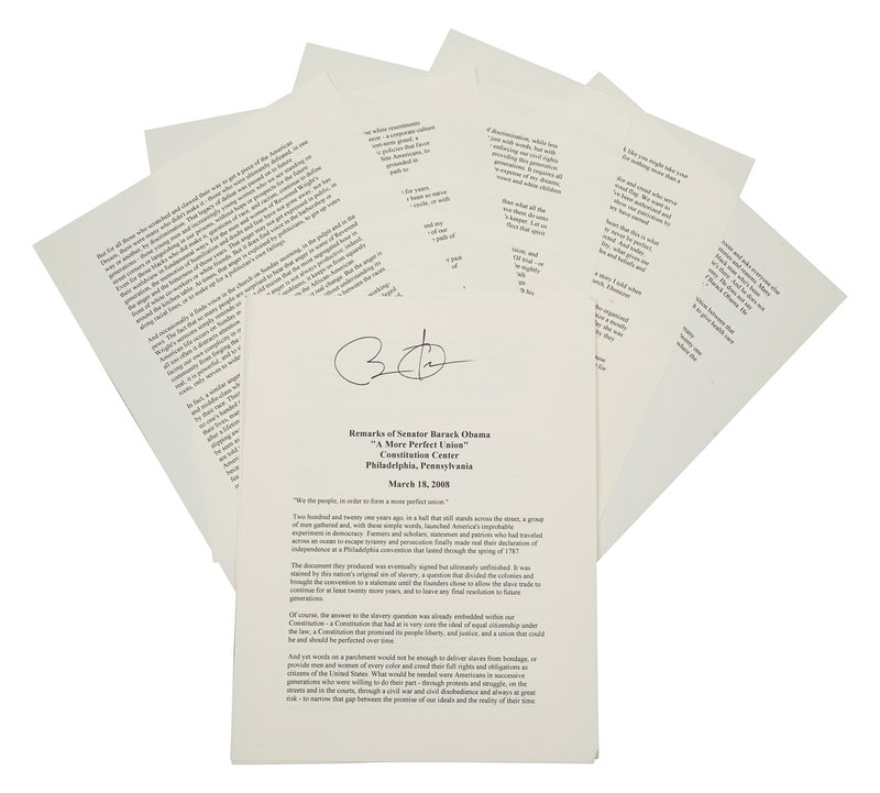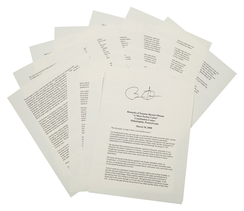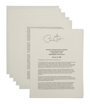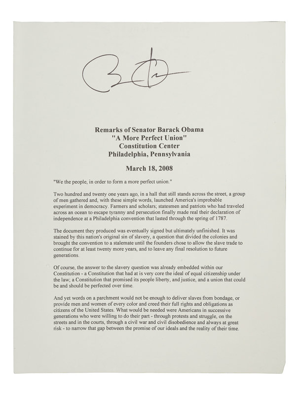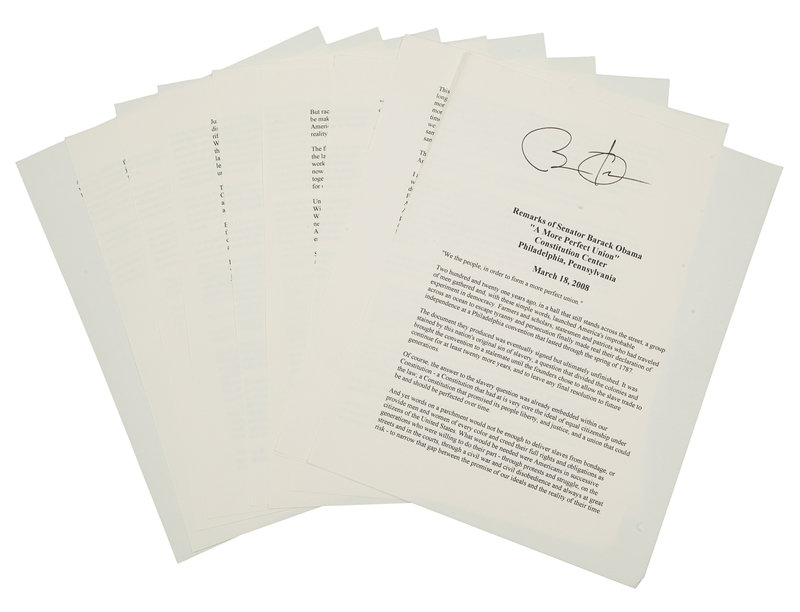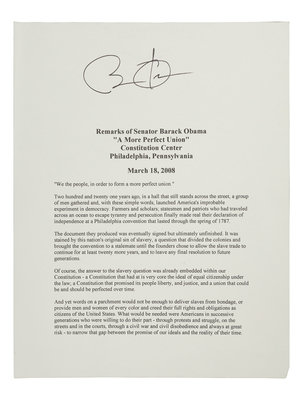 OBAMA, Barack. Duplicated typescript of his speech entitled “A More Perfect Union,” delivered at the Constitution Center in Philadelphia, March 18, 2008. [N.d.]. 10 pp., 4to. SIGNED BY OBAMA at head of the first page. (A few minor creases at edges.) Loose sheets; housed in calf folding case.