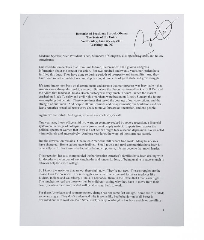 OBAMA, Barack. Duplicated typescript of his State of the Union Address, delivered on January 27, 2010. [N.d.]. 13 pp., 4to. SIGNED BY OBAMA at head of the first page. Stapled at upper left corner; housed in calf folding case.