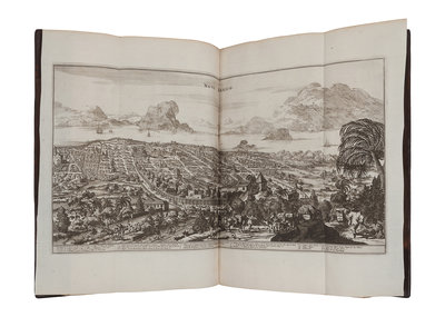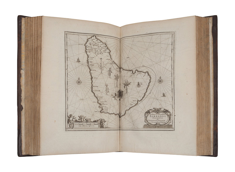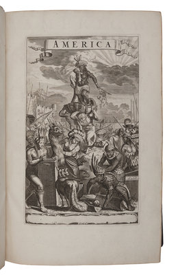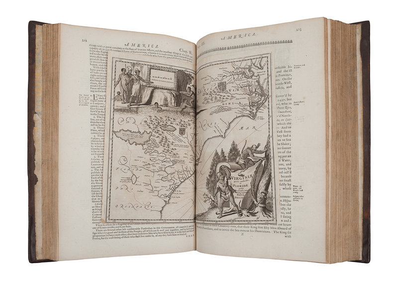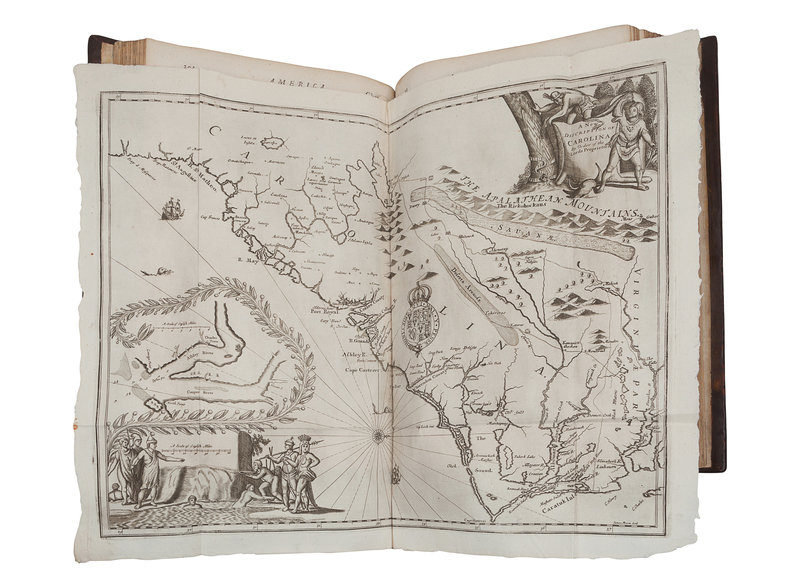 Folio (401 x 258 mm). Engraved allegorical title, letterpress title printed in red and black. 56 engraved plates comprising: 6 portraits, 3 folding views and plans, 17 engraved double-page maps and 30 double-page views; 66 engraved illustrations in text; woodcut initials, head- and tail-pieces. (Without the "Arx Carolina" view [see below], map of Virginia pars Australis apparently supplied and with marginal repair lower right corner, A3 with portion of lower corner margin torn away, O2 with rust-hole affecting a few letters, a few leaves with pale dampstain, otherwise fine.) Contemporary calf gilt, spine gilt, morocco lettering-piece gilt (rebacked preserving original spine, corners renewed); cloth slipcase. Provenance: Charles Palmer, later Charles FitzRoy, 2nd Duke of Cleveland, 1st Duke of Southampton (1662-1870), Charles II of England, Scotland and Ireland’s illegitimate son (early letterpress gift bookplate dated 10 May 1707, engraved armorial bookplate).