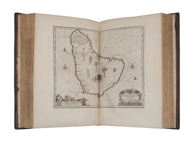 FIRST EDITION IN ENGLISH, second issue, without the "Arx Carolina" plate, and with the Lords Proprietor's map and a map of Barbados. In place of the "Arx Carolina" plate (depicting the castle on the French settlement at present Paris Island) is Moxon's map of Carolina, A New Discription of Carolina By Order of the Lords Proprietors (known as The First Lords Proprietors Map). The map was based on a manuscript map by philosopher John Locke, and is the first large-format map of the newly-settled Carolina colony. Also in the present copy is a copy of the Virginia pars Australis map found in copies of the first issue (likely supplied from another copy).