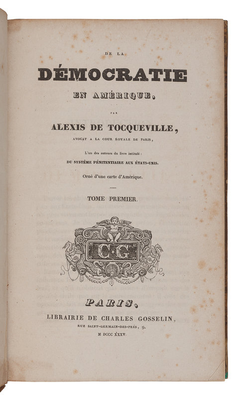 TOCQUEVILLE, Alexis de (1805-1859). De la Démocratie en Amérique. Paris: Bourgogne and Martinet for Charles Gosselin, 1835-1840.