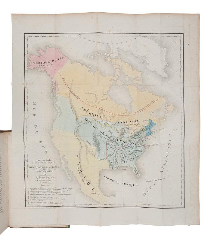 FIRST EDITION of part I, second edition of part II. De Tocqueville’s inquiry into the nature and institutions of American society was written and published in two parts. The first, comprising volumes I and II, was published in Paris in 1835. It was immediately popular, and two additional Paris editions and a Brussels edition appeared in the same year. The second part appeared in 1840. The first American edition was published in 1838 and 1840 (see next lot). de Tocqueville was the first to wrestle with the "new" society, and the first to address the connection between the extraordinary size and natural wealth of America. While he believed in the liberal commonplaces of his time, he was distrustful of a society based on individualism, and he deplored a politics dominated by self-interest. Howes T-278, T-279; Sabin 96060, 96061.
