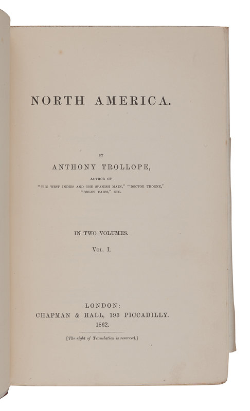 TROLLOPE, Anthony (1815-1892). North America. London: Chapman and Hall, 1862.