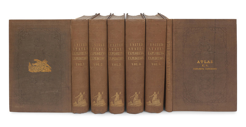 FIRST TRADE EDITION, limited to 1,000 copies, preceded by the official government edition, published in 1844 and limited to 100 copies, and the unofficial edition, published by Lea and Blanchard in 1845 and limited to 150 copies. Wilkes set sail on the first American exploring expedition with a team of scientists and artists in August 1838 to survey the remote regions of the South Pacific. Wilkes and his men explored the South Pacific Islands, Hawaii, Australia, New Zealand, California, Singapore, the Cape of Good Hope, and St. Helena. The United States Exploring Expedition "was the first American scientific expedition of any size, charged to ‘extend the bounds of Science and promote the acquisition of knowledge,’ and was one of the most ambitious Pacific expeditions ever attempted" (Forbes). Wilkes’s survey of the Pacific Islands resulted in over 200 new charts for 280 islands, and he was the first to use the term “Antarctic Continent.” Ferguson 4209; Forbes 1574; Haskell 2B; Howes W-414.