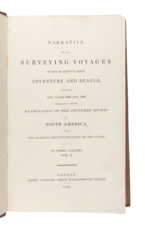 DARWIN, Charles (1809-1882). -- Robert FITZROY, editor (1805-1865), and Capt. Philip Parker KING (1793-1856). A Narrative of the Surveying Voyages of His Majesty's Ships Adventure and Beagle, between the years 1826 and 1836. London: Henry Colburn, 1839.