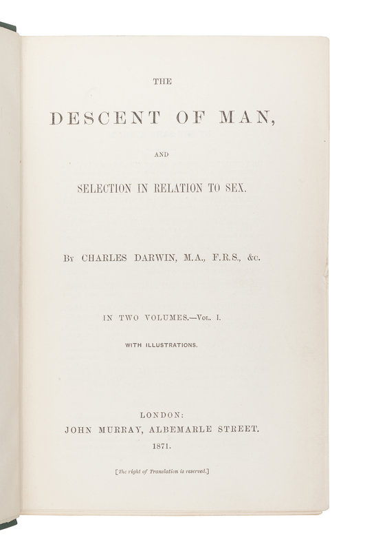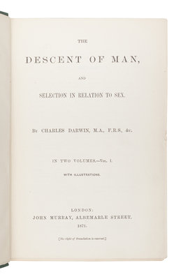 DARWIN, Charles (1809-1882). The Descent of Man, and Selection in Relation to Sex. London: John Murray, 1871.