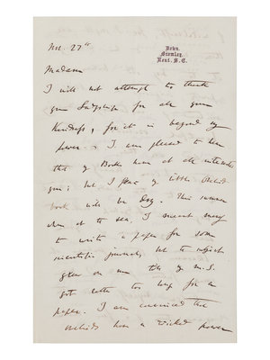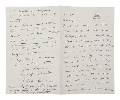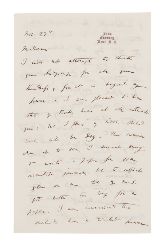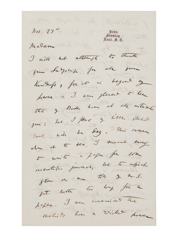 DARWIN, Charles (1809-1882). Autograph letter signed (“Charles Darwin”) to Lady Dorothy Fanny Nevill (“Madam”), Down, Bromley, Kent, 27 November [1861]. 4 pages, 8vo (203 x 127 mm), on a bifolium. Creased.