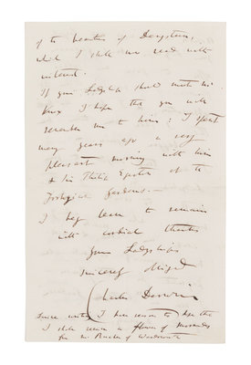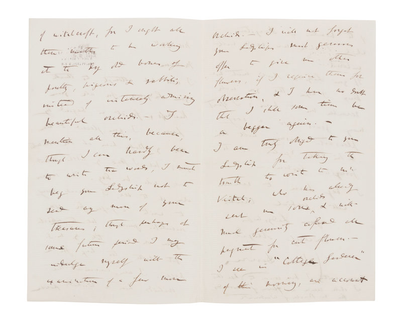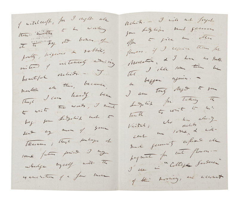 “…I am pleased to hear that my Books have at all interested you; but I fear my little Orchid book will be dry. This summer when at the sea, I meant merely to write a paper for some scientific journal, but the subject grew on me till my M.S. got rather too long for a paper. I am convinced that orchids have a wicked power of witchcraft, for I ought all these months to be working at the dry old bones of poultry, pigeons, and rabbits instead of intensely admiring beautiful orchids. - I mention all this, because, though I can hardly bear to write the words, I must beg your Ladyship not to send any more of your treasures; though perhaps at some future period I may indulge myself with the examination of a few more orchids. - I will not forget your Ladyships most generous offer to give me other flowers, if I require them for observation, & I have no doubt that I shall some time be a beggar again of the beauties - I am truly obliged to your Ladyship for taking the truth to write to Mr. Veitch [Chelsea nursery firm of James Veitch]; who has already sent me some orchids & with much generosity refused[?] all payment for cut flowers. - I see in ‘Cottage Gardner’ of this morning, an account of the beauties of Dangstein, which I shall now read with interest.”
