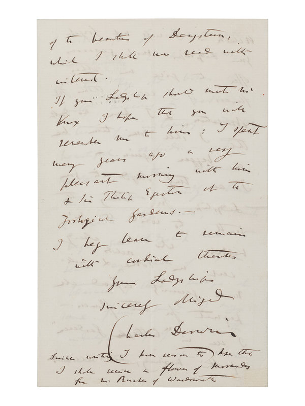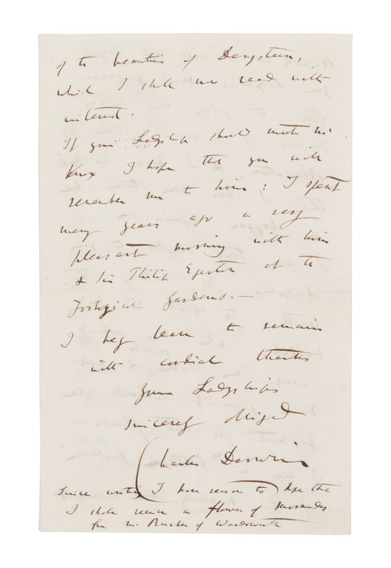 Darwin also sends his regards to naturalist Arthur Edward Knox and paleontologist Sir Philip Egerton: “If your Ladyship should meet Mr [Arthur Edward] Knox I hope that you will remember me to him: I spent many years ago a very pleasant morning with him & Sir Philip Egerton at the Zoological Gardens…” In a postscript he adds: “Since writing I have reason to hope that I shall receive a flower of Mormodes from Mr Rucker of Wandsworth”.